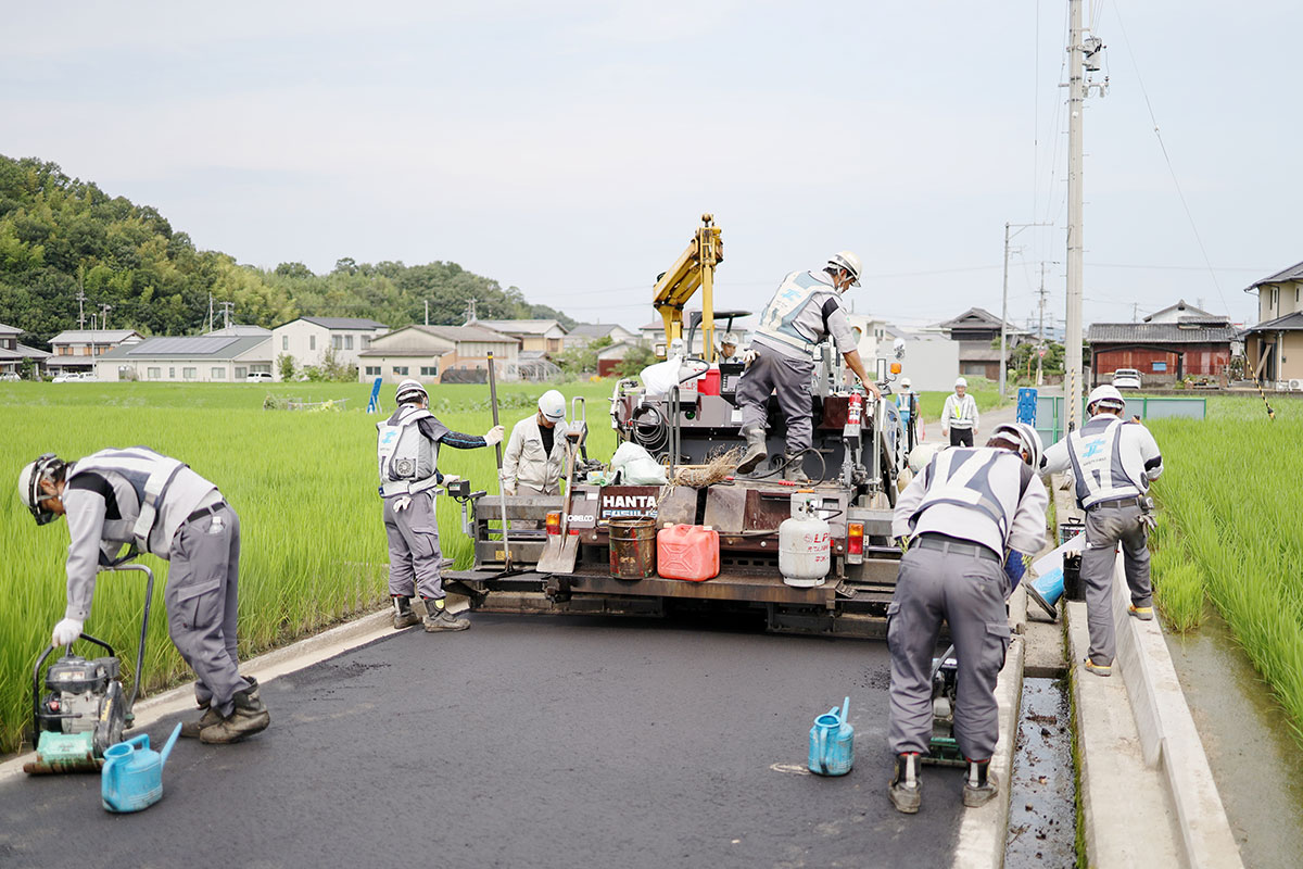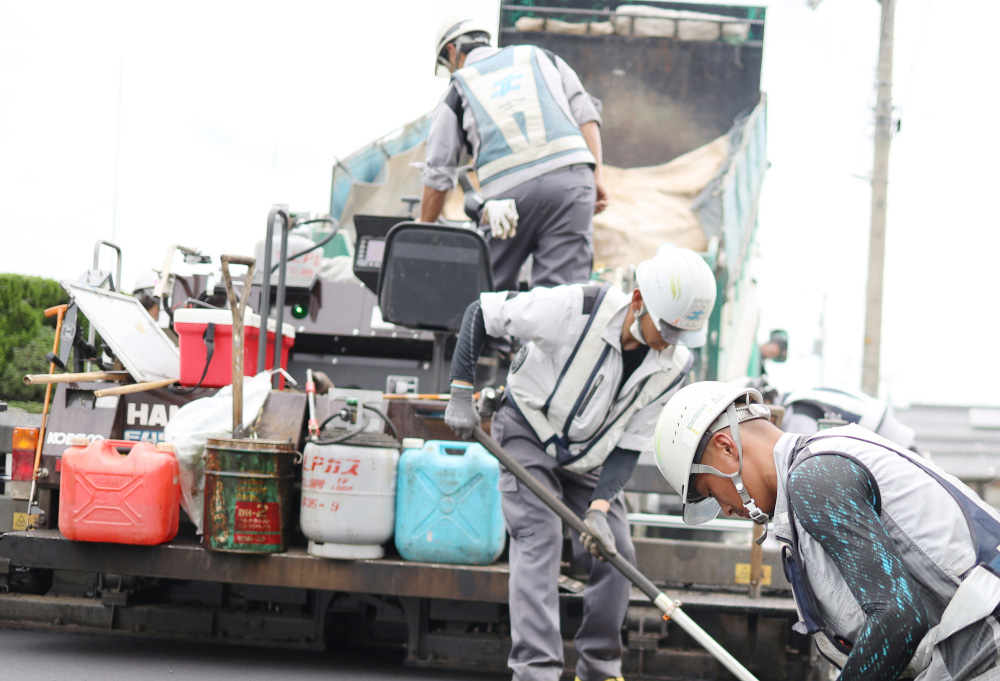 舗装工事は皆で力を合わせて行うチーム作業です。時には何層もの工程が発生することもありますが、チームワークで役割を決めて取り掛かります。